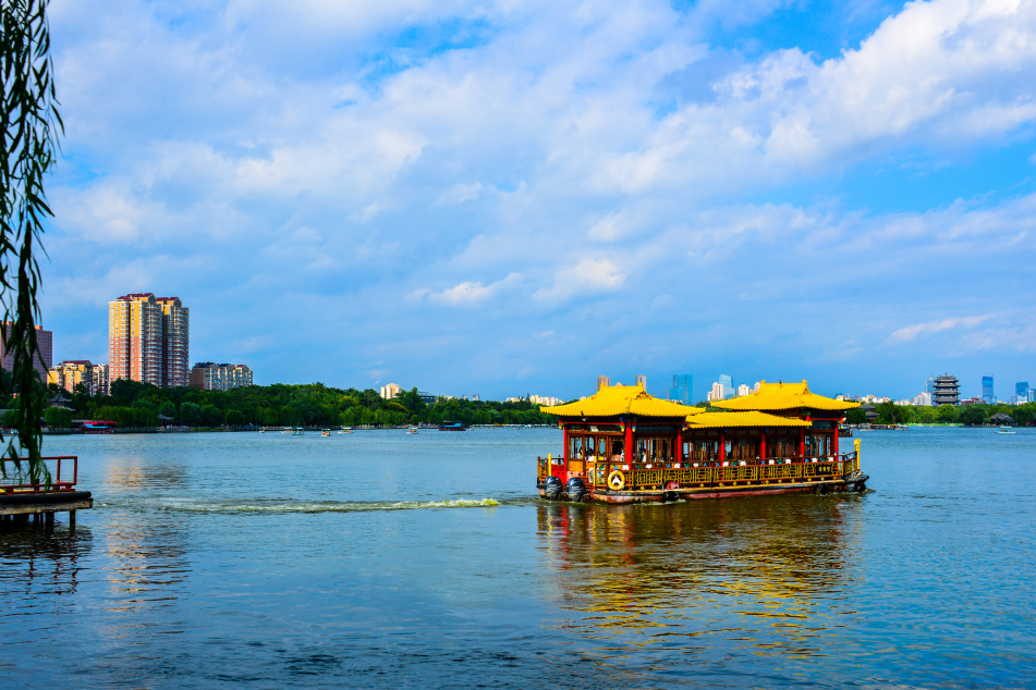紅色的船身古樸典雅,時(shí)尚大氣,徜徉在大明湖的湖面上,秀美風(fēng)光,讓人感受到兒時(shí)“讓我們蕩起雙槳”的悠閑自在。無論是選擇觀光游覽船,還是豪華游舫,都能讓你身臨其境地感受初夏大明湖的詩情畫意。