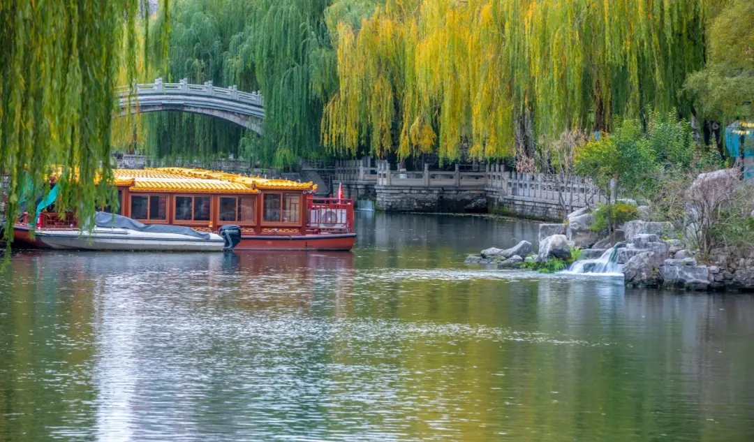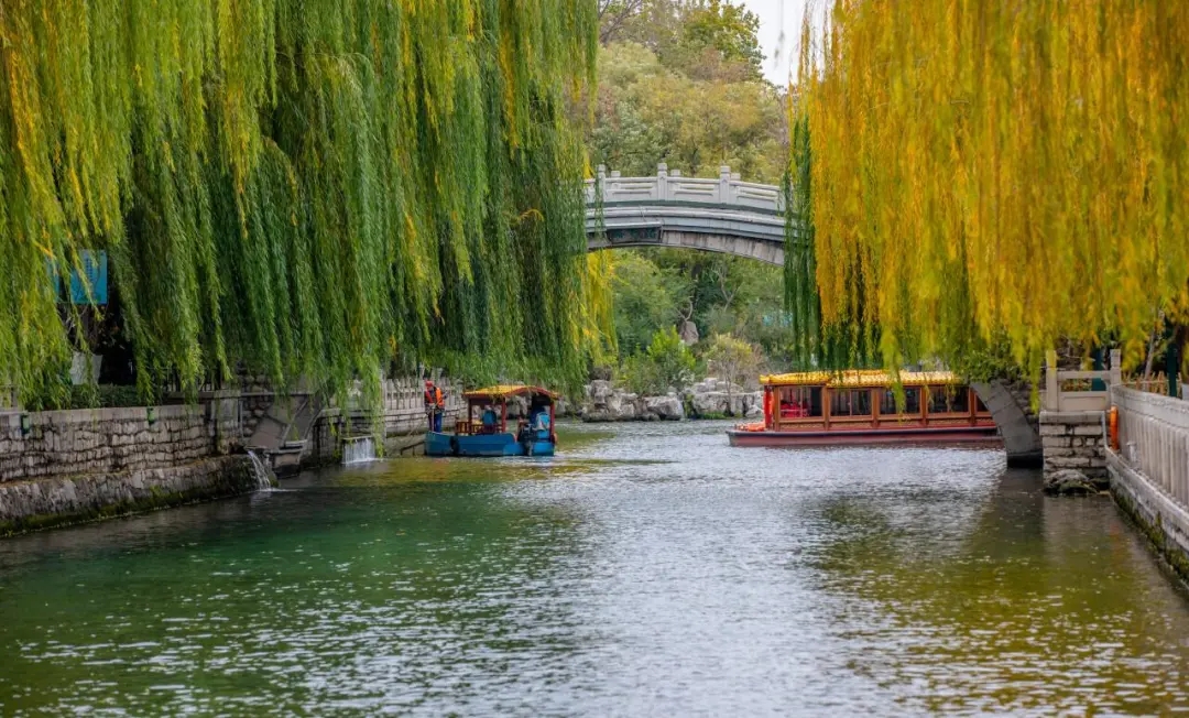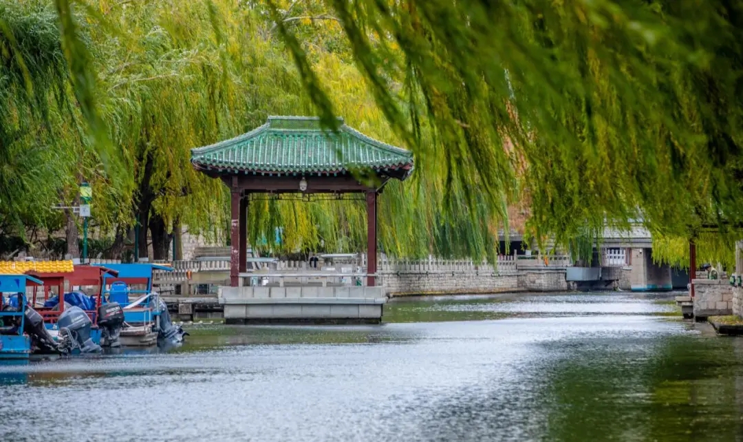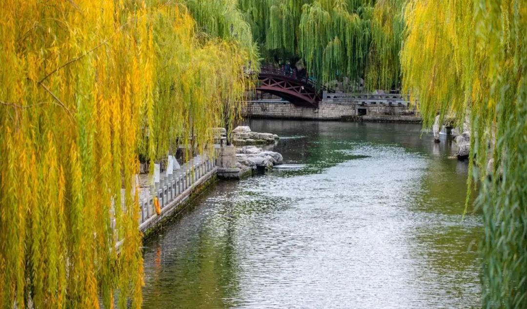 濟(jì)南護(hù)城河仿佛玉帶,環(huán)繞古城,清泉奔流,柳枝搖曳。陽光映照之下,盡顯詩意之美,仿佛一秒就能入畫。