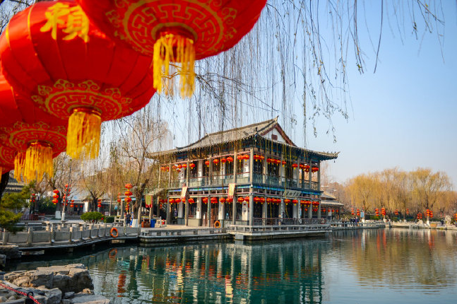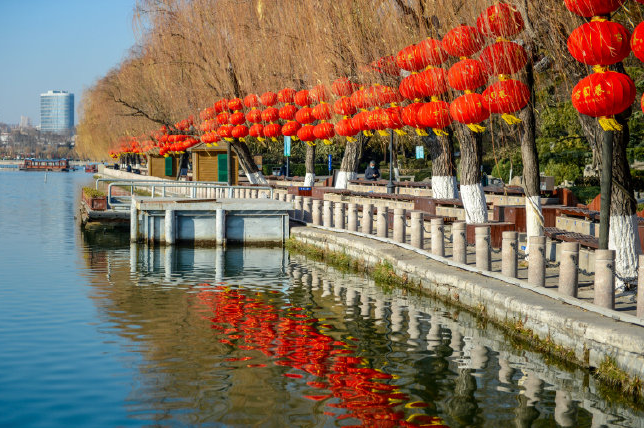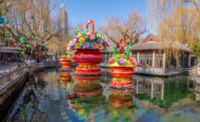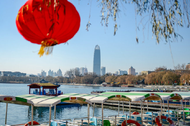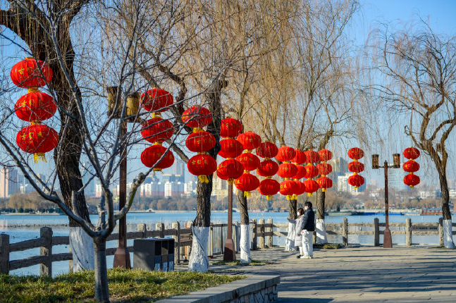 在大明湖景區(qū),眾多大紅燈圍著湖岸布置,營造出濃厚火熱的節(jié)日氣氛。