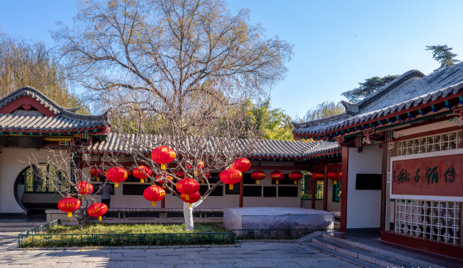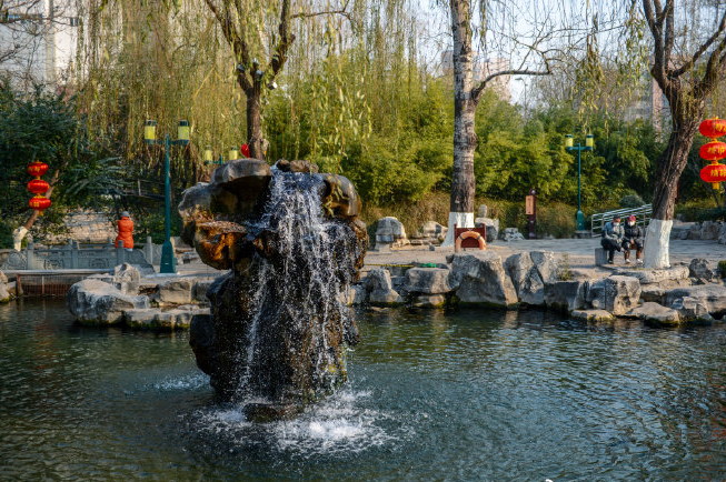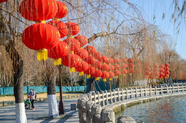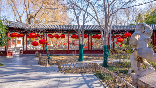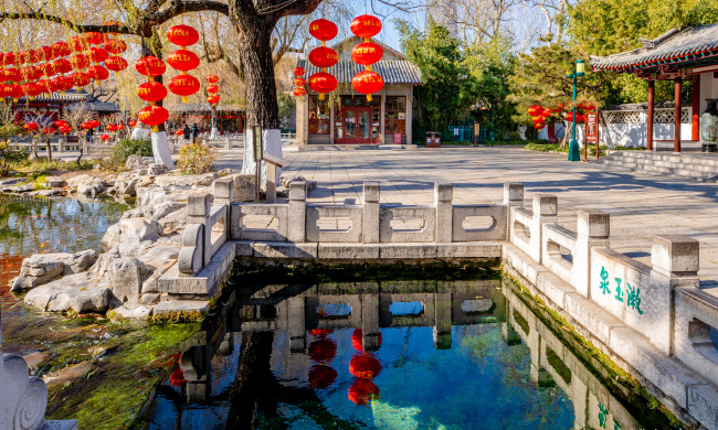 冬日里的濟南五龍?zhí)毒皡^(qū),顏色依舊豐富多彩,游客們趁著冬日暖陽在這里賞景游玩,一串串大紅燈籠高高掛,給略顯冷清的公園增添了吉祥喜慶的色彩,也為即將到來的新年帶來了濃濃的暖意。