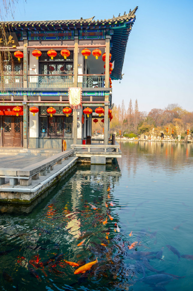 湛藍的湖水,碧藍的晴空,紅紅的大燈籠,這就是現(xiàn)在大明湖的各種顏色,以上元素的組合營造出濃厚火熱的節(jié)日氣氛,共同構(gòu)成一幅充滿生機的喜慶圖畫,預(yù)備迎接四面八方的人們。