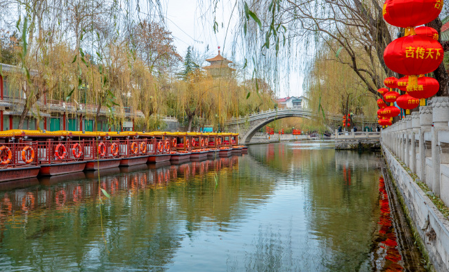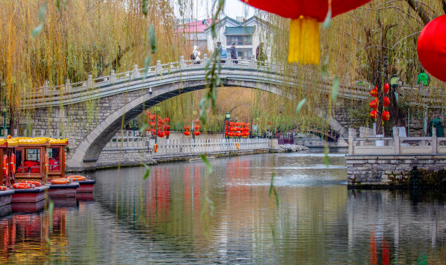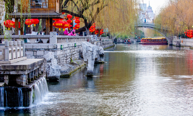 大紅燈籠掛滿河邊,和碧藍的河水構(gòu)成最美的泉水景觀,營造出紅火的節(jié)日氣氛。尤其是當(dāng)夜幕降臨,泉水、彩燈、燈籠交相輝映,把景區(qū)裝點得五彩斑斕。