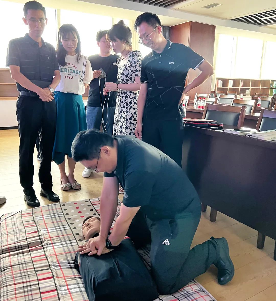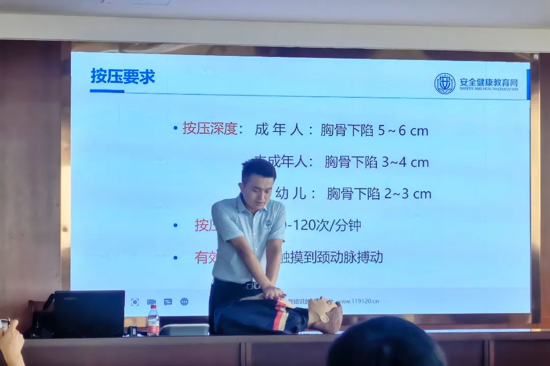 授課期間,健康教育專(zhuān)家通過(guò)課件的形式圍繞著職業(yè)健康知識(shí)普及如何實(shí)施職業(yè)健康保護(hù)、如何預(yù)防心腦血管疾病等方面的內(nèi)容進(jìn)行了深入淺出的講解。同時(shí),為了進(jìn)一步提高培訓(xùn)效果,使大家真正掌握實(shí)操的處置能力,在完成授課內(nèi)容后,又組織安排實(shí)施了心肺復(fù)蘇胸外按壓應(yīng)急救護(hù)模擬練習(xí),大家按照講解的操作流程,積極參與演練,在專(zhuān)家的指導(dǎo)下,大家操作規(guī)范,方法得當(dāng),模擬練習(xí)取得圓滿成功。