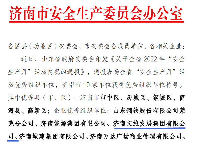 近日,省安委會下發(fā)通知,通報全省2022年“安全生產(chǎn)月”活動情況,并對活動優(yōu)秀組織單位進行通報表揚,濟南文旅集團榮獲全省“優(yōu)秀組織單位”稱號。