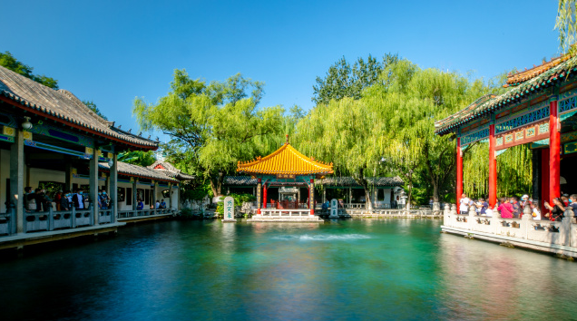 說到趵突泉,還有一個(gè)傳說,當(dāng)年龍王為報(bào)答一位叫做鮑全的年輕人,贈(zèng)送了一把白玉壺,里面的水永遠(yuǎn)不會(huì)被飲用完,鮑全為很多窮苦人治好了病。州官聽說后,就派人去搶。鮑全把白玉壺埋在院子,公差在院子里挖到白玉壺卻搬不動(dòng),只聽“噗通”一聲,平地上突然涌出一股水來。濺起的水花遍布全城,水滴落下的地方就出現(xiàn)一眼泉水,從此濟(jì)南成了著名的泉城。