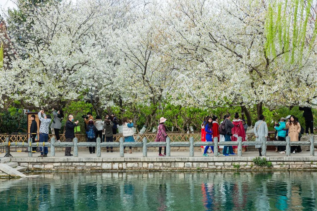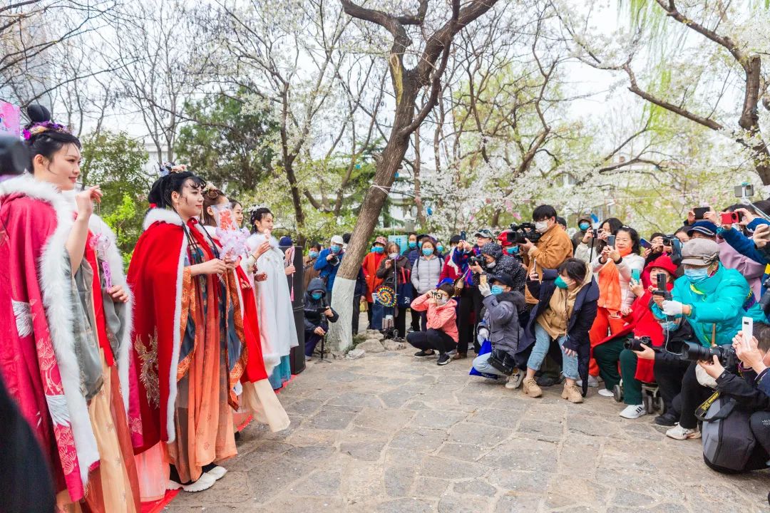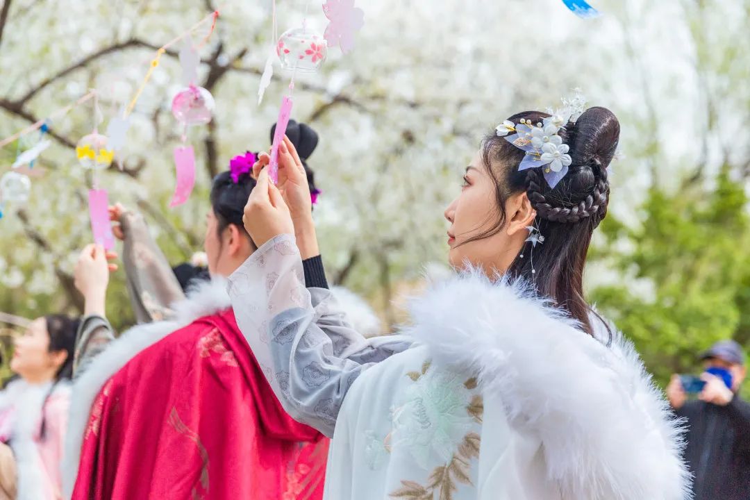 櫻花節(jié)期間將推出櫻花文化風(fēng)情展和特色演藝互動活動,每周六周日組織漢服巡游。微風(fēng)拂過,泉水映襯,五龍?zhí)豆珗@櫻花林內(nèi)的清香沁入心脾,透過陽光,有花瓣飄落,身著華服的小姐姐們在樹下經(jīng)過,仿佛穿越千年,又似人間仙境。同時,五龍?zhí)豆珗@東門小廣場特設(shè)了“櫻雨心愿”活動區(qū)。市民游客可將心愿寫在愿望卡上,懸掛于櫻花樹下。