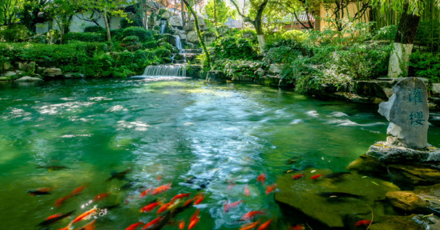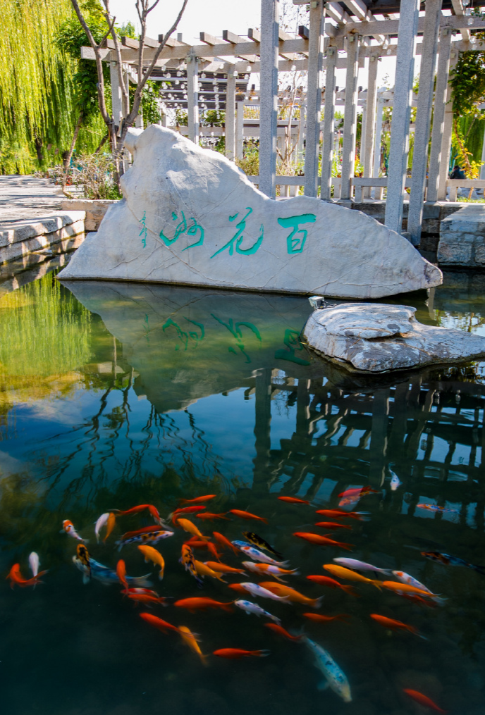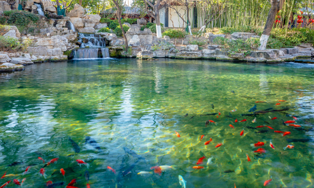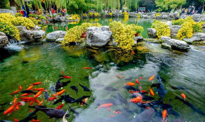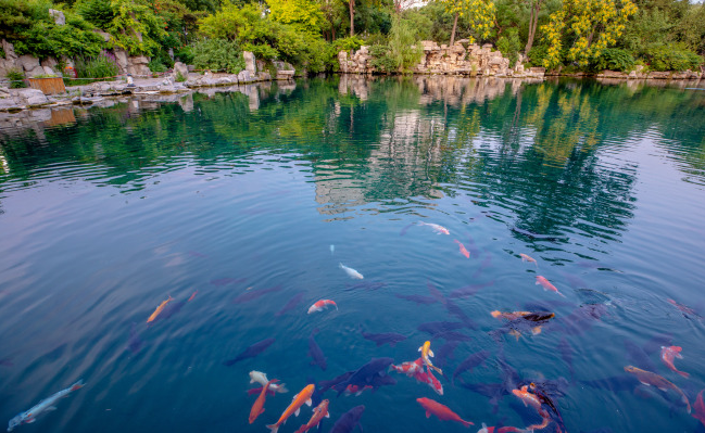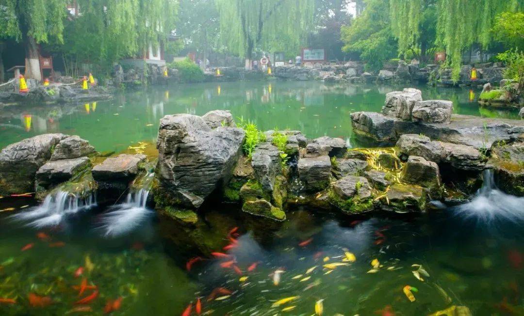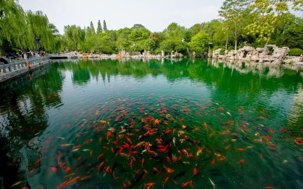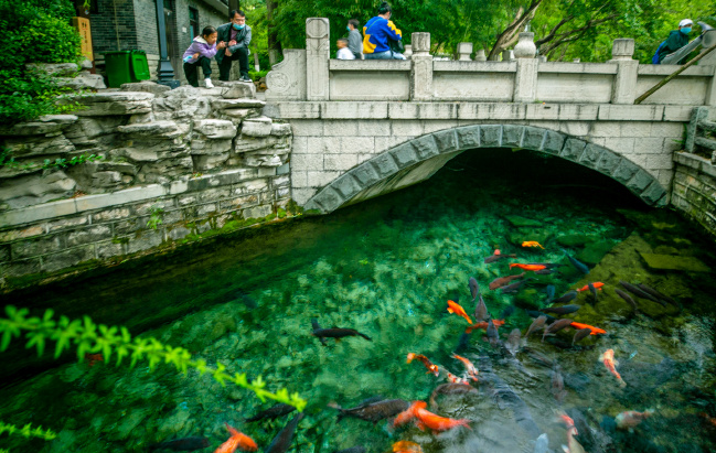 珍珠泉向來有“一泓映綺疏”美名,連名字都取自珍貴的寶藏。泉水清澈見底,無數(shù)魚兒在水底游來游去。在這里,占據(jù)視線最多的便是在水中嬉戲的錦鯉,這些精靈上下翻飛,襯得泉水歡騰靈動(dòng)。這樣和諧的景象特別又新鮮,格外惹人貪看。