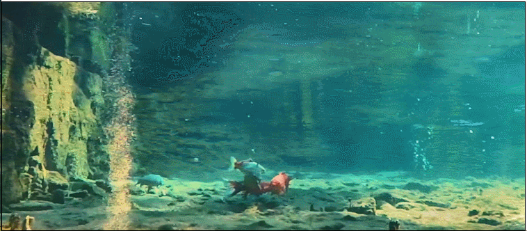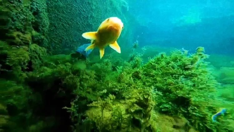 在這清澈瓦藍(lán)的泉池中,多彩的魚兒們似一束束彩帶輕飛曼舞,又像一道道彩虹靈光閃動(dòng),賞心悅目,情趣橫生。