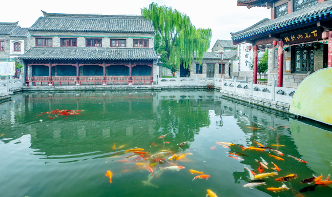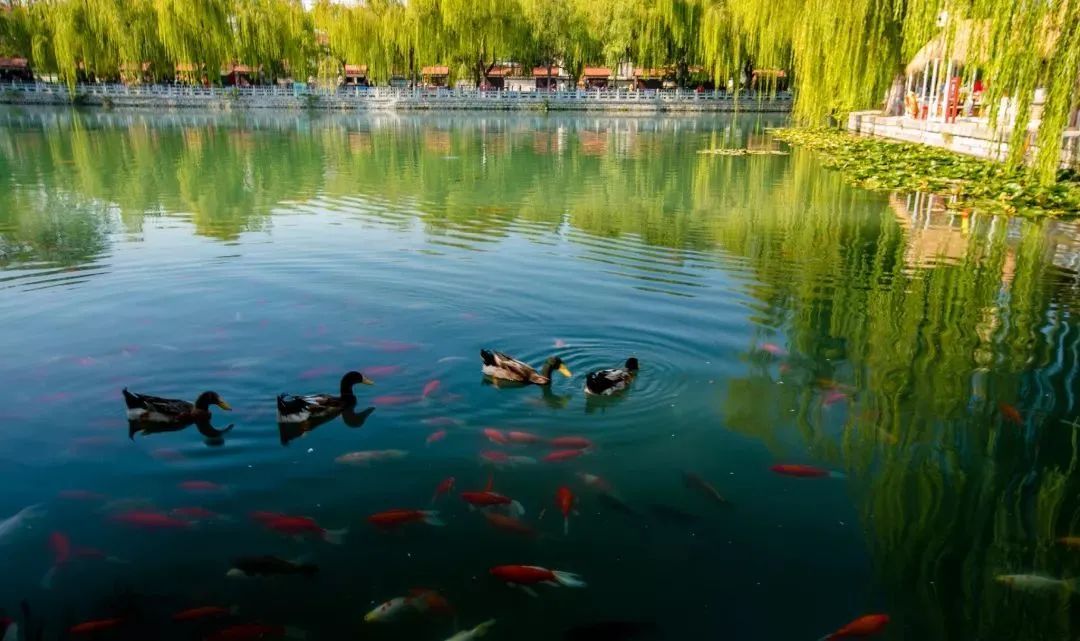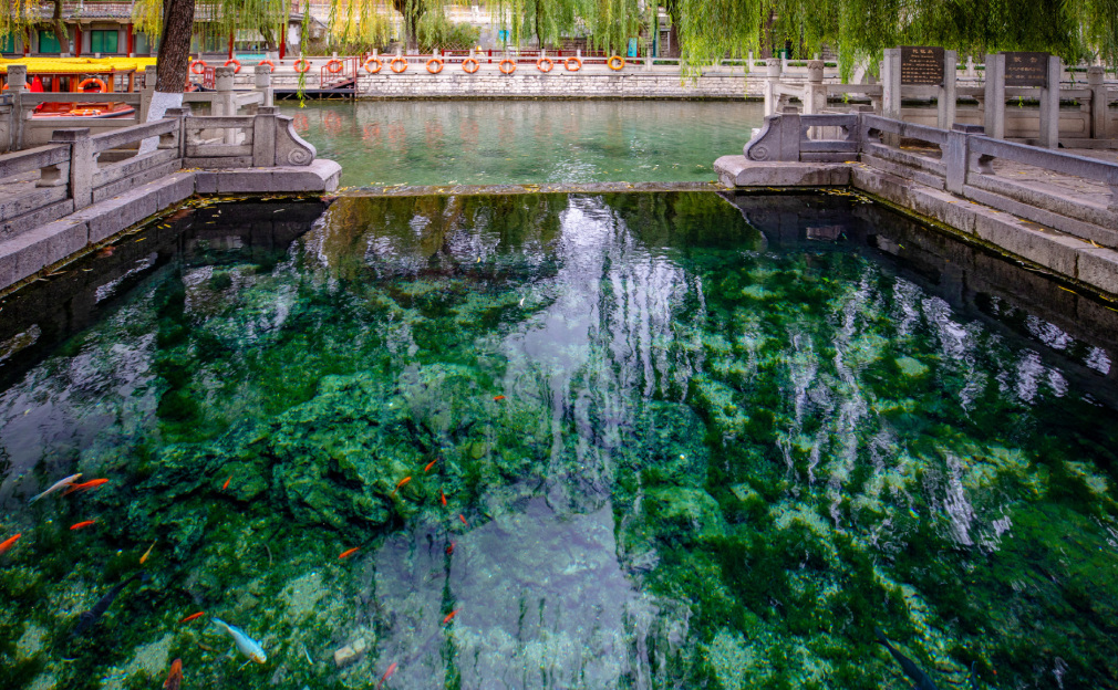 護(hù)城河邊還分布著白石泉、瑪瑙泉、琵琶泉、黑虎泉等泉水,構(gòu)成了黑虎泉泉群。清澈見底的泉池里錦鯉戲水,煞是好看。