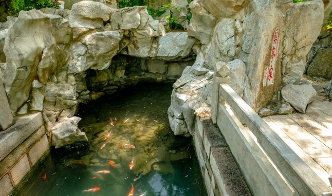 園內(nèi)的名士閣東側(cè)懸掛匾額“龍?zhí)队^魚”,匾額下,是公園最大的泉池五龍?zhí)?,這里是賞魚的主景點(diǎn)。潭中五彩錦鯉無數(shù),成群戲逐,吸引眾多游人于潭邊喂魚、賞魚,更與周邊幽靜清雅的環(huán)境相映成趣,令人心曠神怡、流連忘返,是濟(jì)南著名景觀之一。