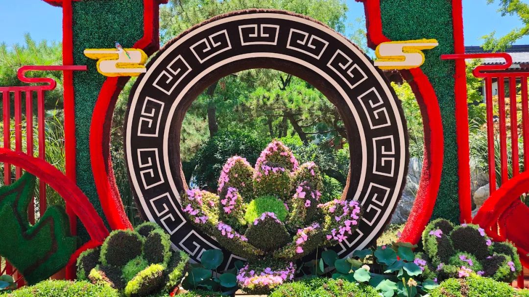 東門外廣場大型造型命名為“荷諧玫好”,由荷花、玫瑰兩種市花及扇面組成。扇面中的曲線代表著山水如畫,與蝴蝶、云彩、燈籠等吉祥要素共同組成了一幅和諧美好的畫面。鋼琴廣場品種荷花造型名為“魚躍龍門”,由中國古代神話故事激發(fā)靈感創(chuàng)作,表達了奮發(fā)向上、夢想成真、金榜題名之意。
