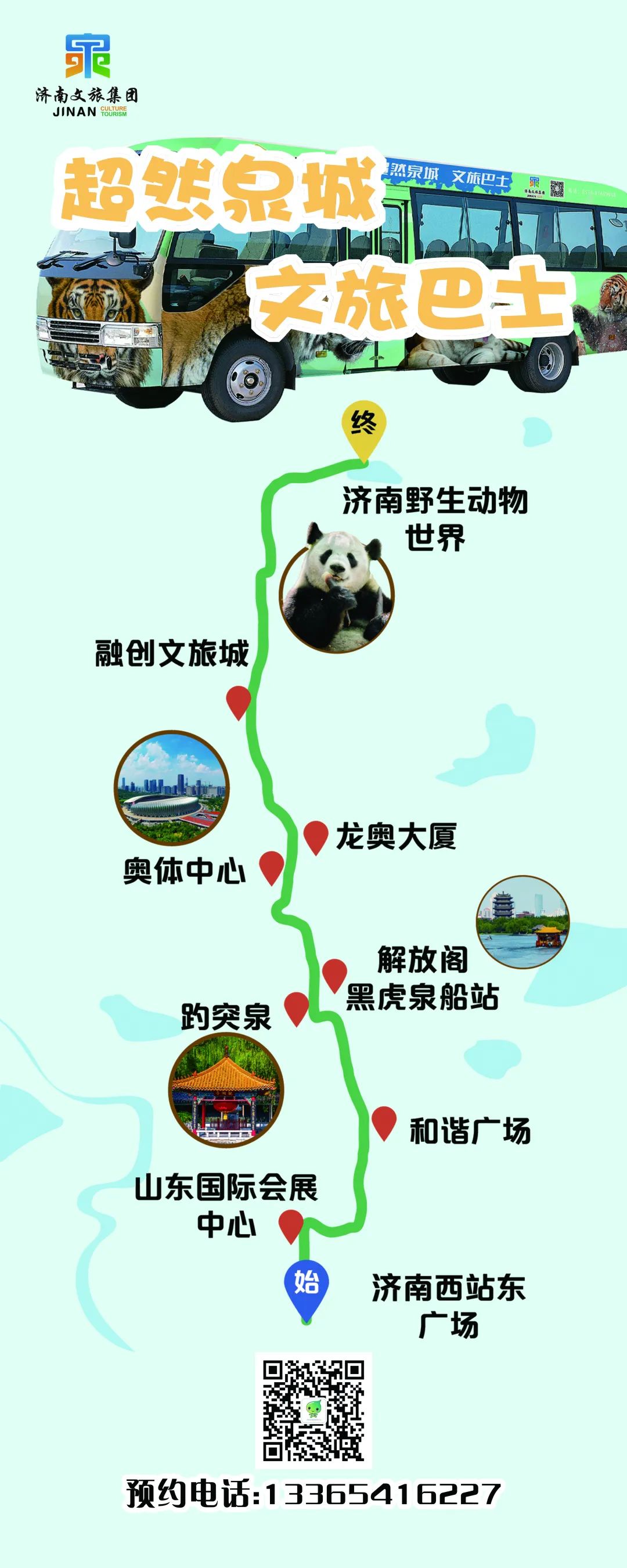 文旅巴士行車線路及站點(diǎn):濟(jì)南西站東廣場(chǎng)(旅服中心)—會(huì)展中心—和諧廣場(chǎng)—趵突泉(東門)—解放閣(黑虎泉船站)—奧體中心(西門)—龍奧大廈(南門)—融創(chuàng)文旅城(北門)—濟(jì)南野生動(dòng)物世界(東門)