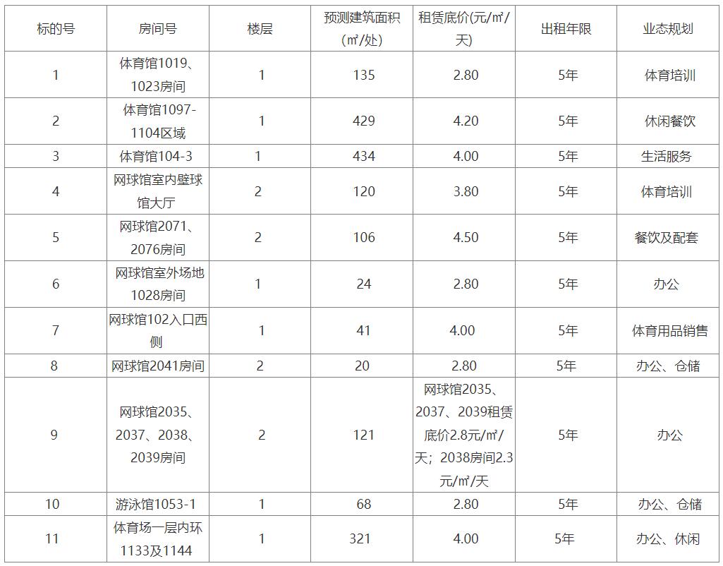 1、項目內容:濟南文旅產業(yè)運營管理有限公司對其所屬濟南奧體中心房產進行公開招租。本項目共分11個標的,可兼投兼中。擬出租的房屋位于濟南奧林匹克體育中心園區(qū)內,具體招標內容如下: