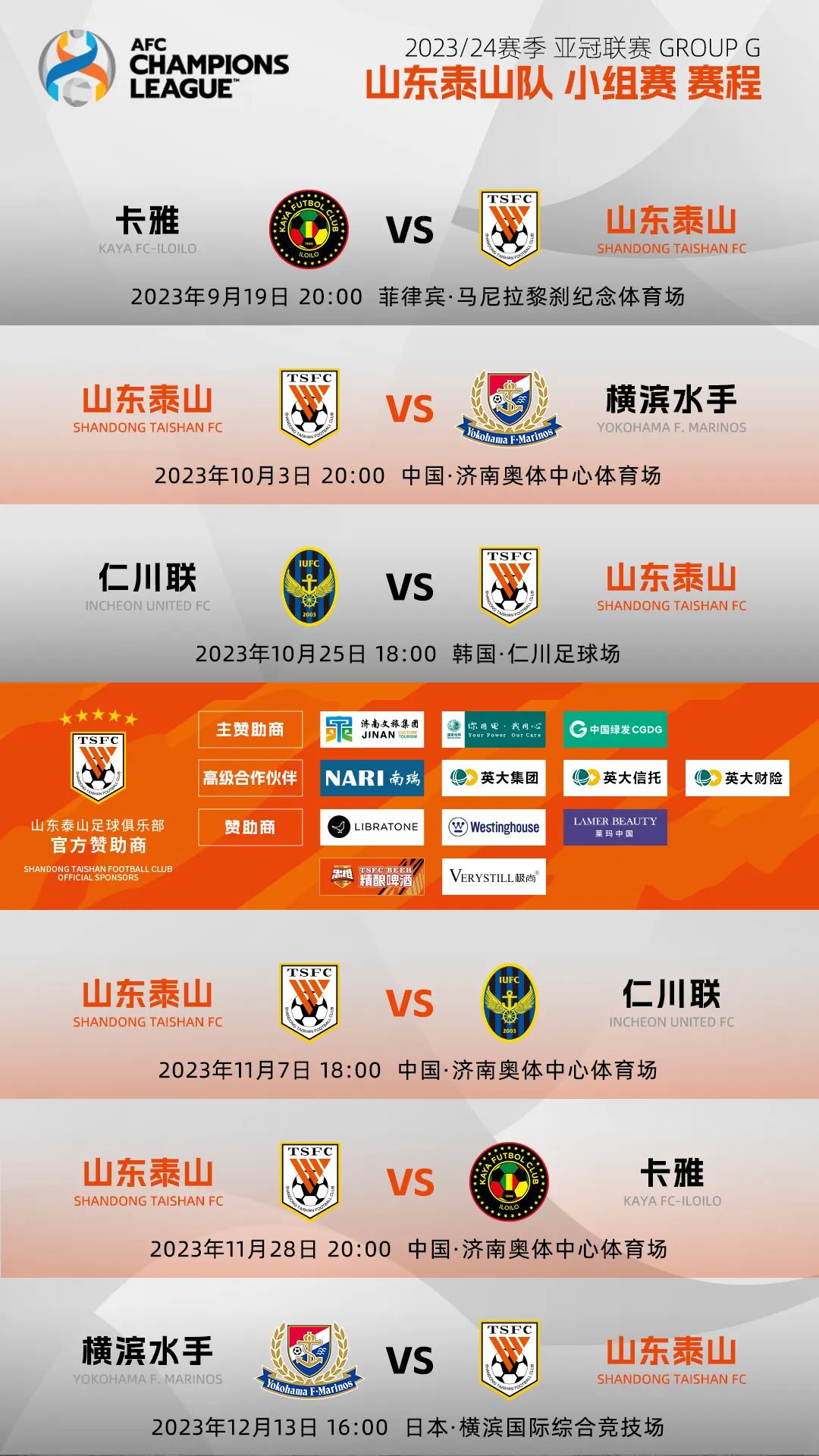 以下為2023/24亞冠聯(lián)賽小組賽山東泰山隊詳細(xì)賽程: