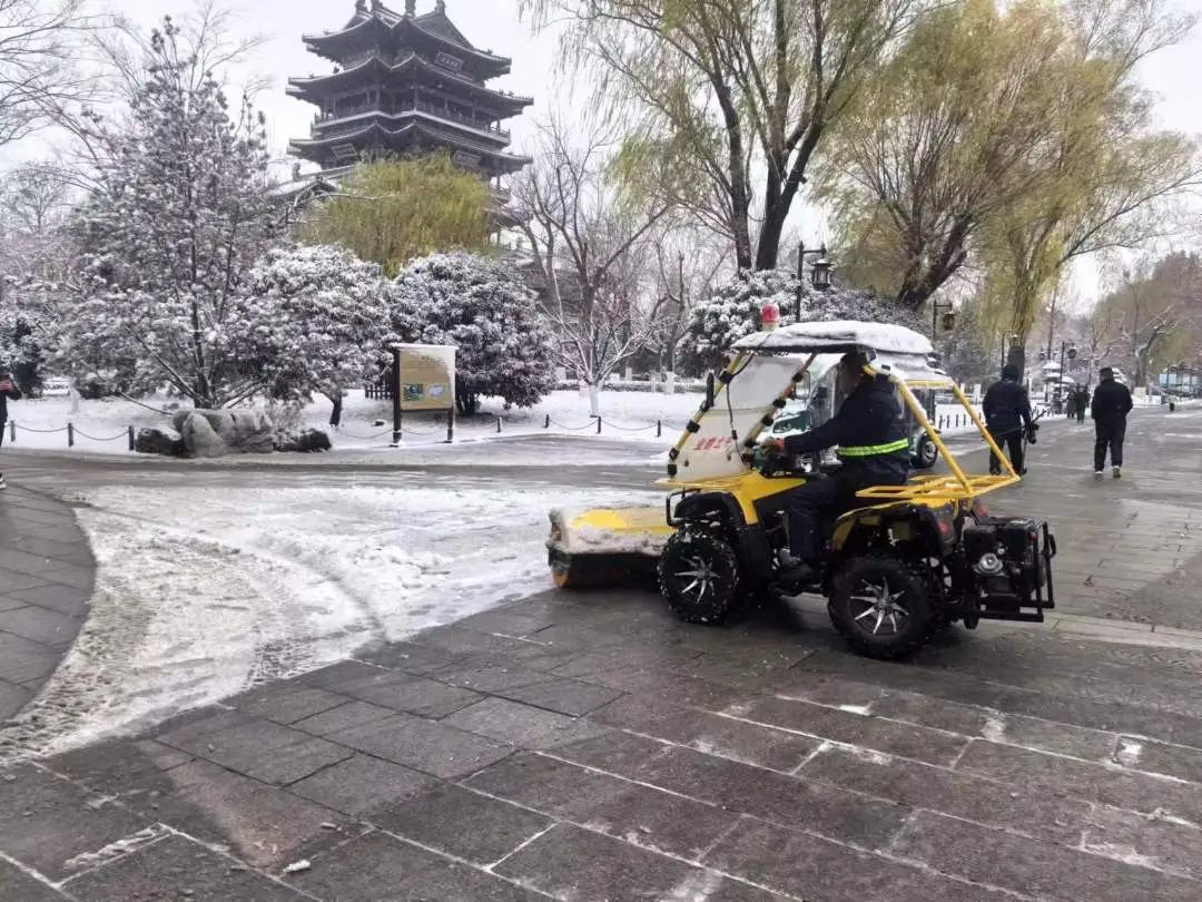 天下第一泉景區(qū)接到雪情預(yù)報(bào)后,啟動應(yīng)急預(yù)案,夜間預(yù)留掃雪人員50余人,第一時間在園區(qū)各橋梁、出入口等處鋪設(shè)防滑材料,擺放防滑提示,設(shè)置語音提示。掃雪采取機(jī)械掃雪和人工清雪相結(jié)合,共投入人工200余人次,投放掃雪車2臺、改裝叉車1臺、灑水車1臺清理主干道積雪,人工清理廣場、橋頭積雪,使用竹桿等清理樹上積雪,真正做到雪停路清。