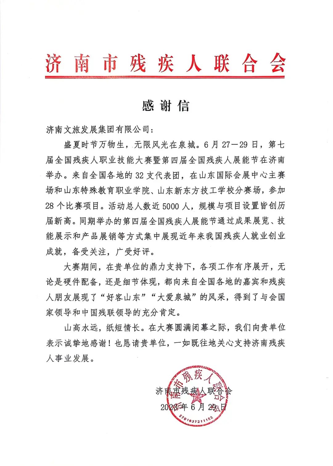 近日,濟南市殘疾人聯(lián)合會向濟南文旅集團發(fā)來感謝信,感謝信稱:6月27一29日,第七屆全國殘疾人職業(yè)技能大賽暨第四屆全國殘疾人展能節(jié)在濟南舉辦。在貴單位的鼎力支持下,各項工作有序展開,得到了與會國家領(lǐng)導(dǎo)和中國殘聯(lián)領(lǐng)導(dǎo)的充分肯定。在大賽圓滿閉幕之際,我們向貴單位表示誠摯地感謝!也懇請責(zé)單位,一如既往地關(guān)心支持濟南殘疾人事業(yè)發(fā)展。