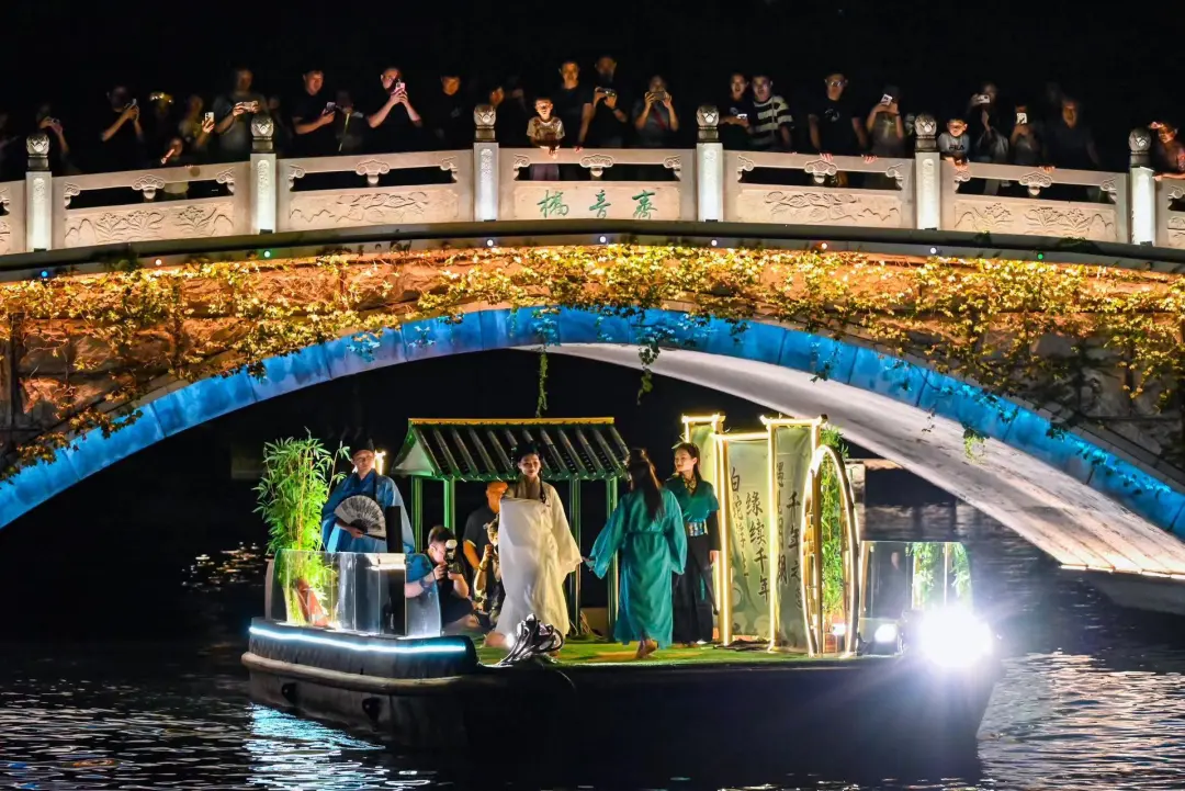 本次演出融合國(guó)漫電影《白蛇·浮生》元素,打造電影主題國(guó)風(fēng)船只,演員化身電影中的經(jīng)典角色白蛇、青蛇與許仙,配合電影經(jīng)典片尾曲《千年等一回》、主題曲《浮生一白》、定情曲《何須問》等優(yōu)美旋律,在七夕節(jié)當(dāng)晚現(xiàn)場(chǎng)演繹白娘子與許仙的愛情故事,將這段發(fā)生在西湖的美麗故事轉(zhuǎn)移至大明湖,續(xù)寫經(jīng)典愛情神話,營(yíng)造七夕浪漫氛圍,展現(xiàn)城市文化旅游深厚底蘊(yùn)。