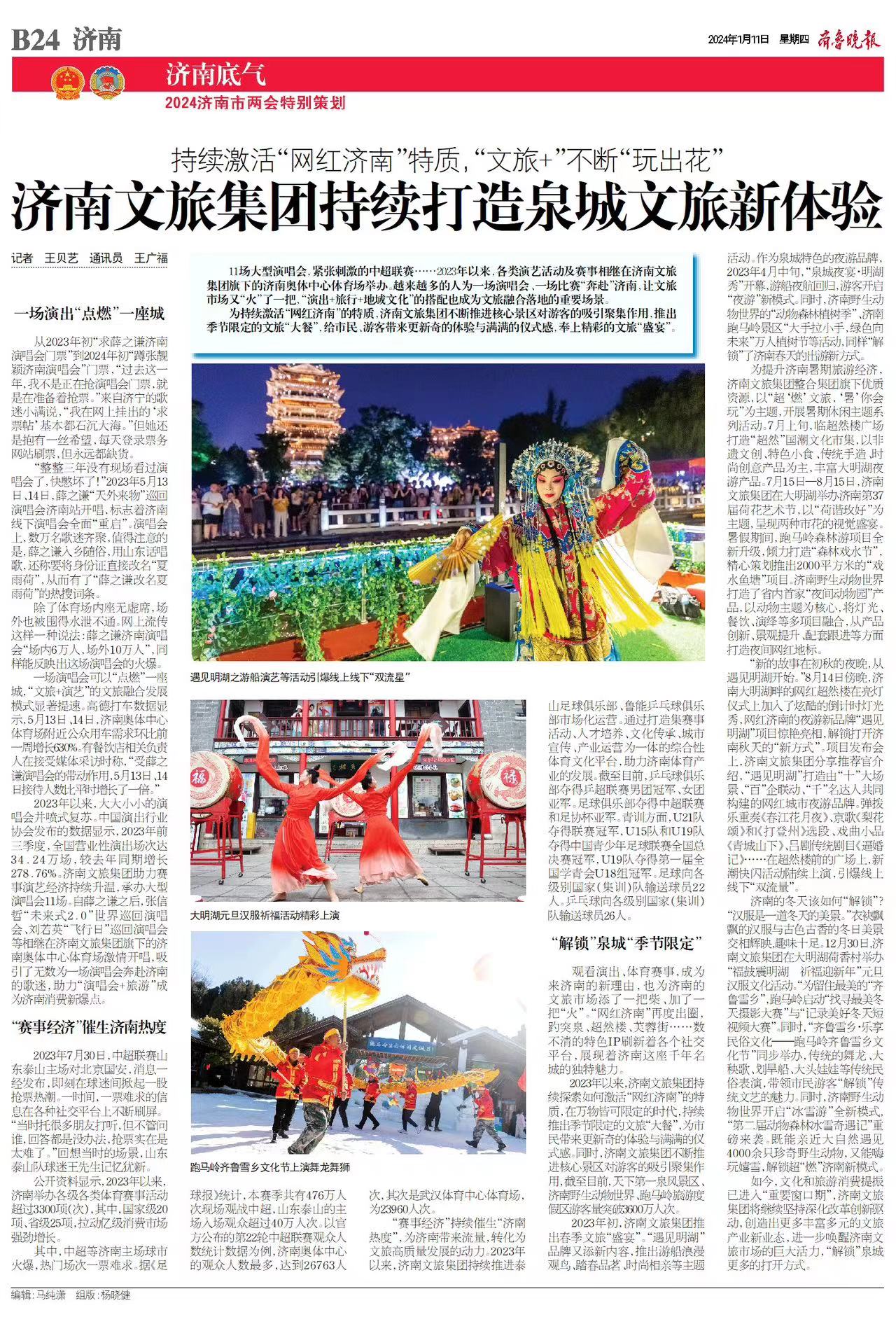 2024年1月11日,《齊魯晚報(bào)》兩會(huì)特刊刊發(fā)《持續(xù)激活“網(wǎng)紅濟(jì)南”特質(zhì),“文旅+”不斷“玩出花”——濟(jì)南文旅集團(tuán)持續(xù)打造泉城文旅新體驗(yàn)》的文章,采寫(xiě)記者為王貝藝。文章寫(xiě)到,為持續(xù)激活“網(wǎng)紅濟(jì)南”的特質(zhì),濟(jì)南文旅集團(tuán)不斷推進(jìn)核心景區(qū)對(duì)游客的吸引聚集作用,推出季節(jié)限定的文旅“大餐”,給市民、游客帶來(lái)更新奇的體驗(yàn)與滿(mǎn)滿(mǎn)的儀式感,奉上精彩的文旅“盛宴”。如下為稿件詳情——